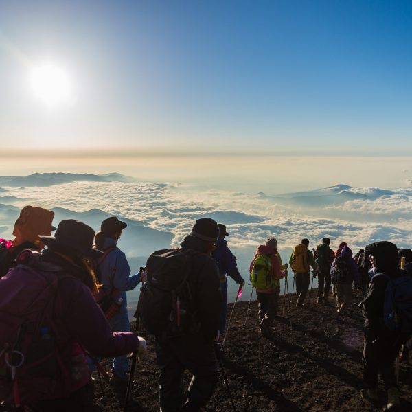 El momento culminante llega con el amanecer en la cima del Fuji, cuando el sol se eleva sobre el horizonte del Pacífico y tiñe de oro las nubes y los cráteres. Es un instante de recogimiento y asombro, donde el esfuerzo se transforma en emoción pura. En Japón lo llaman Goraiko, la luz sagrada del primer sol, y vivirlo desde la cima es una experiencia que marca.