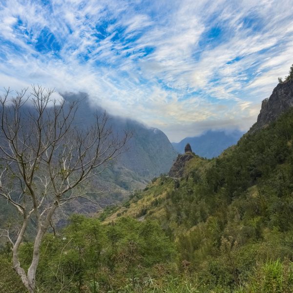 Tras la noche en el Gîte de la Roche Écrite, la marcha prosigue por la reserva natural de Roche Écrite, un espacio protegido que conserva una biodiversidad única en la isla. El camino se convierte pronto en un auténtico mirador sobre el gran circo de Mafate, ofreciendo panorámicas espectaculares de este anfiteatro natural, aislado y majestuoso.