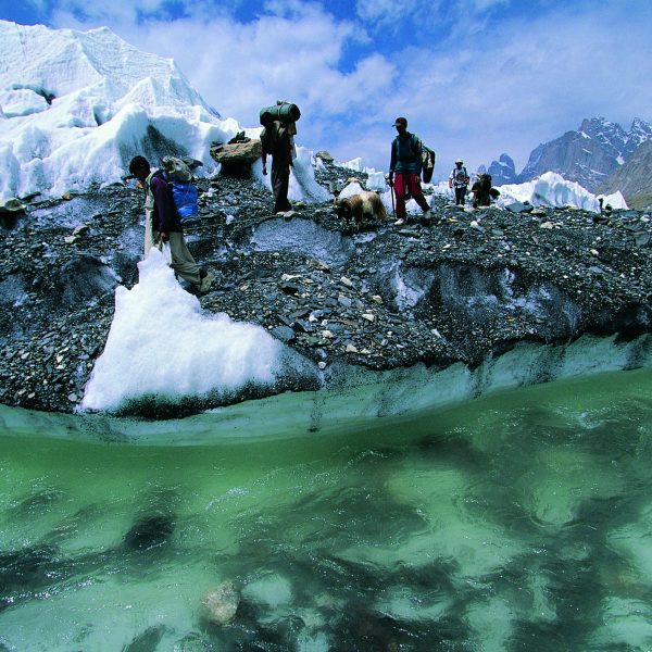 Invertiremos unos 90 minutos en cruzar el glaciar Khani Bassa. Es un recorrido relativamente fácil, con una hermosa vista al norte, hacia la suave cúpula blanca del SAR Kanjut, a 7760 m.