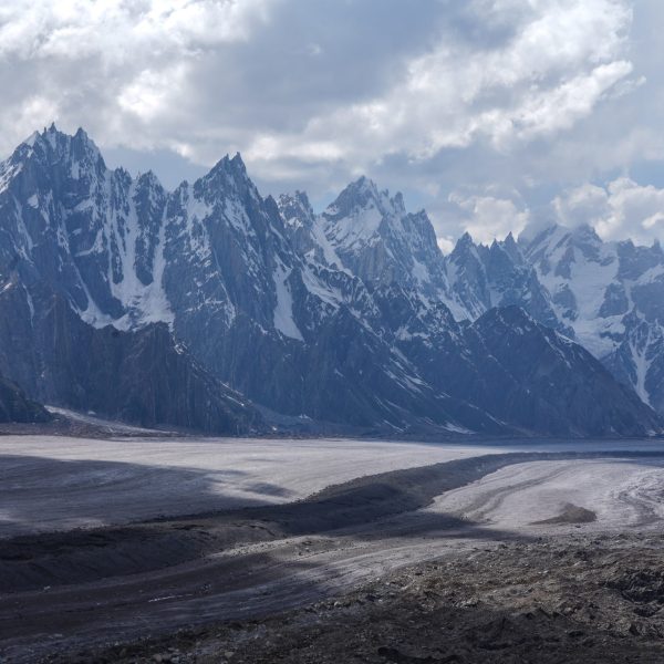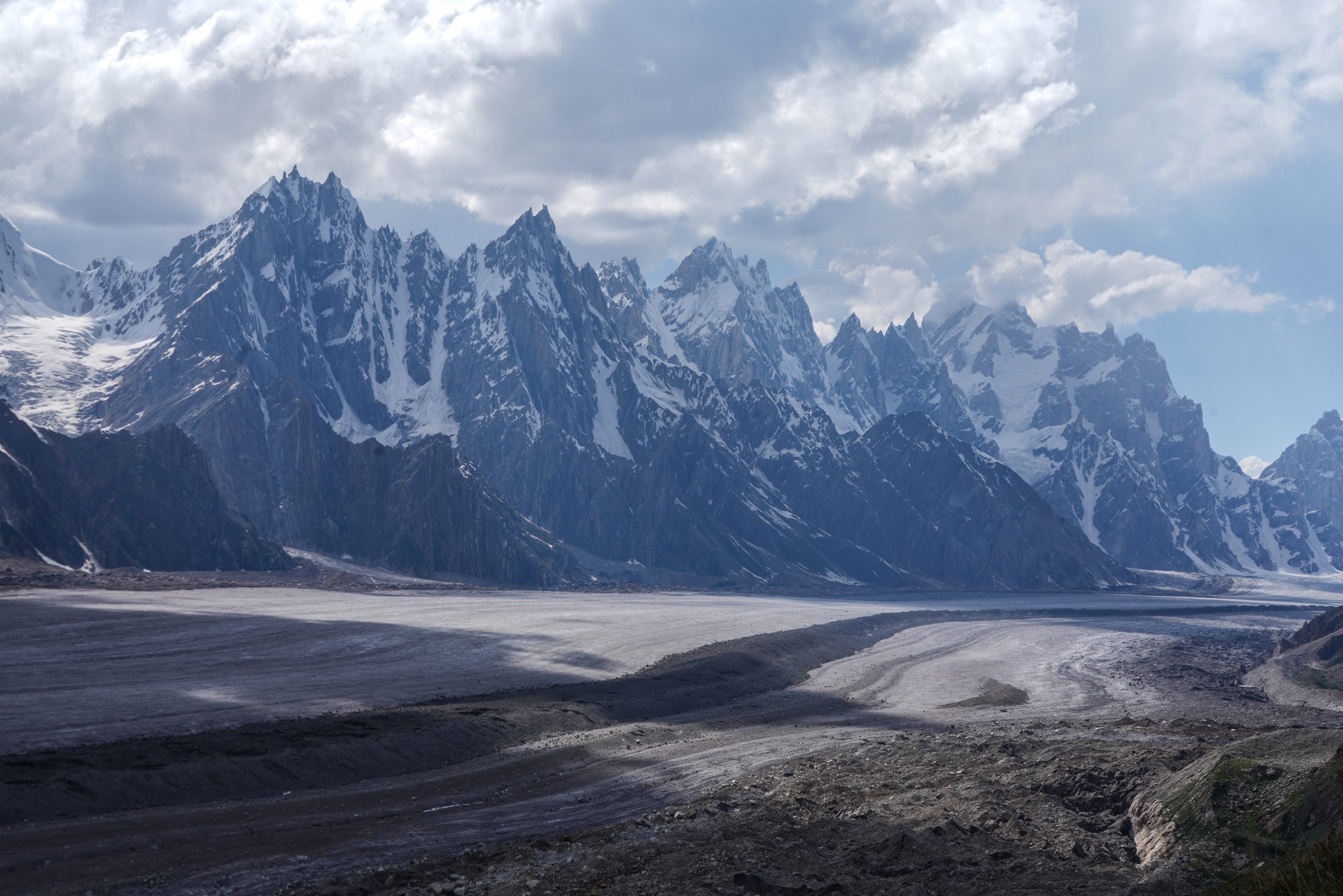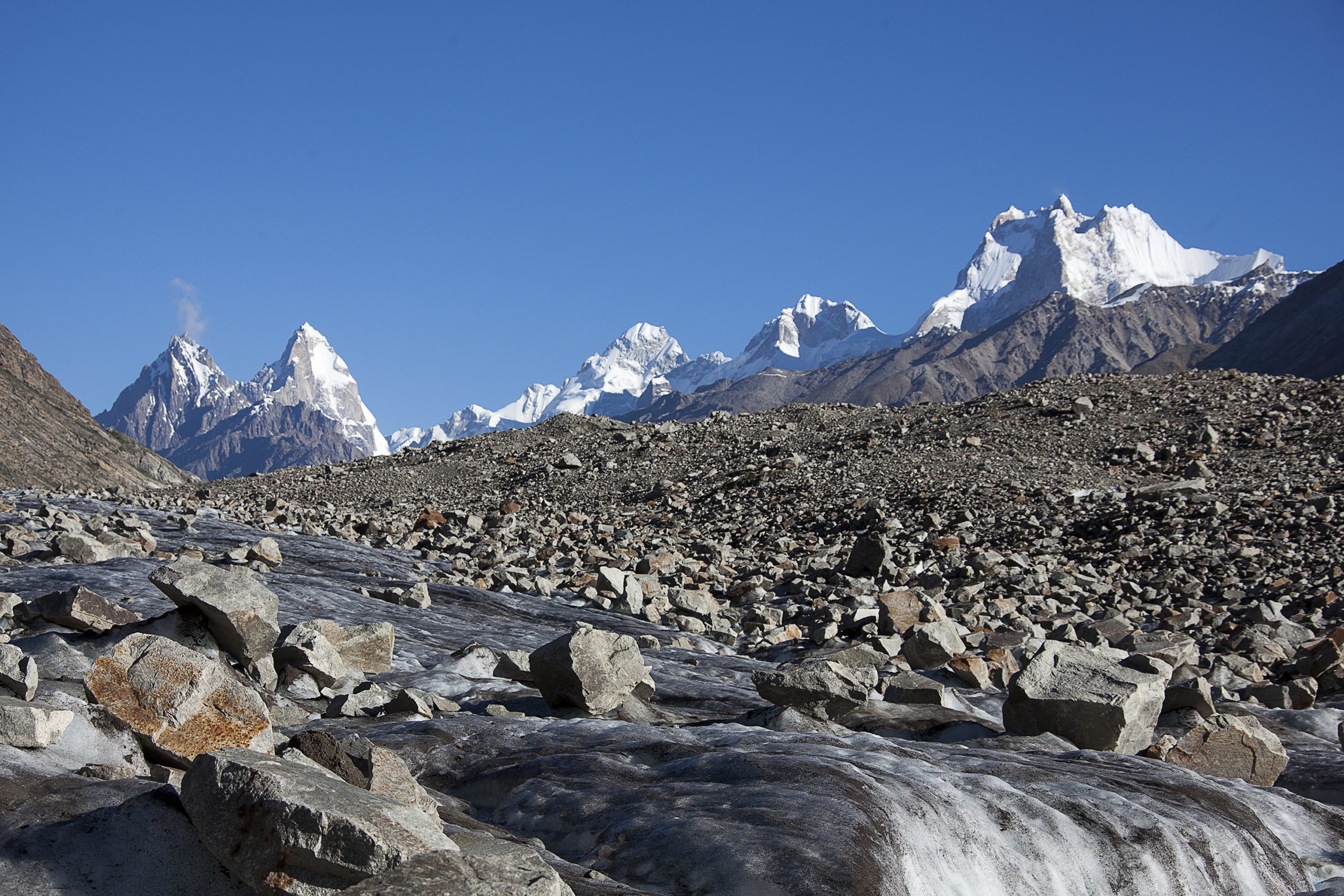 Hoy seguiremos caminando por el glaciar Biafo en dirección norte, podremos disfrutar hoy en gran parte de la ruta de las tres montañas Latok: Latok-1 (7145 m), Latok-II (7108 m) y Latok-III (6949 m).