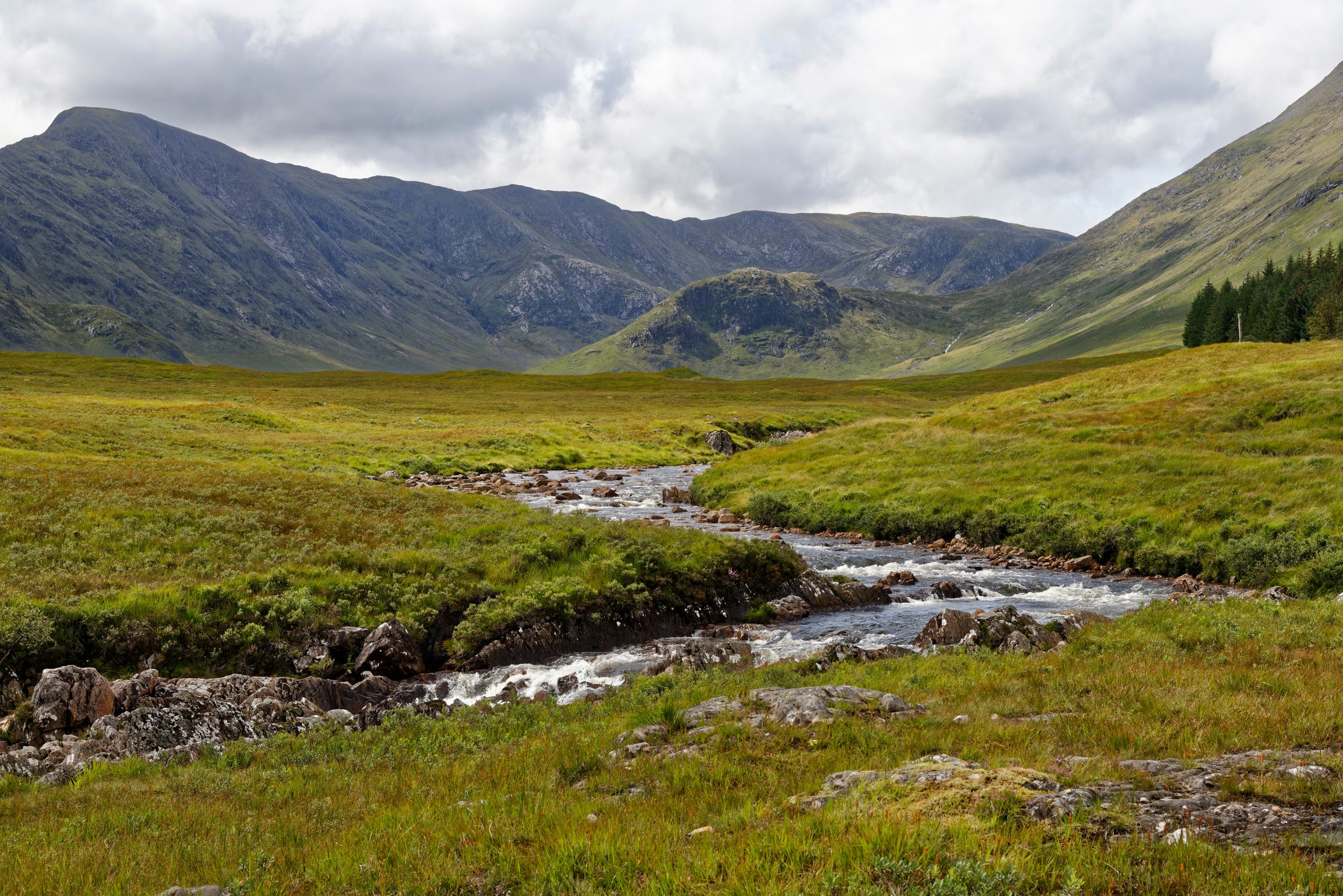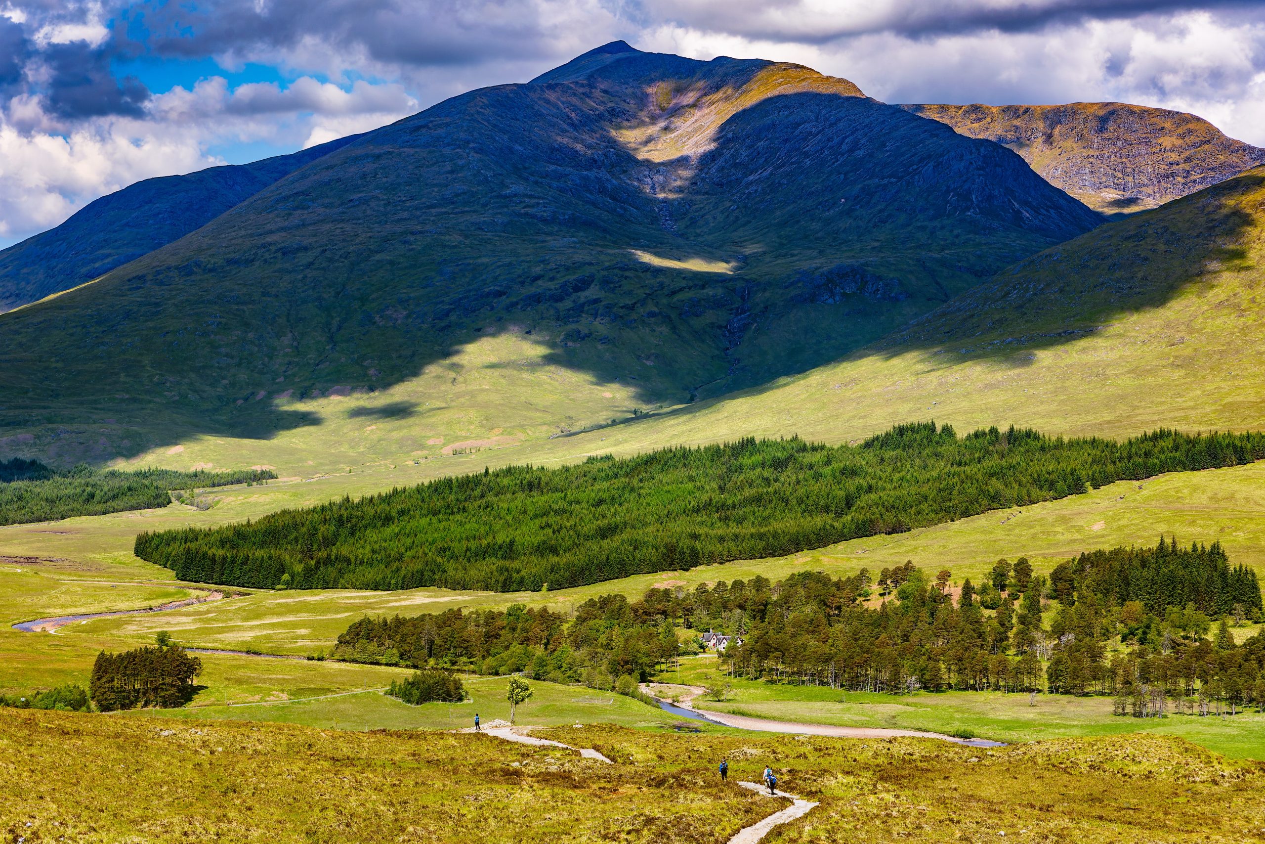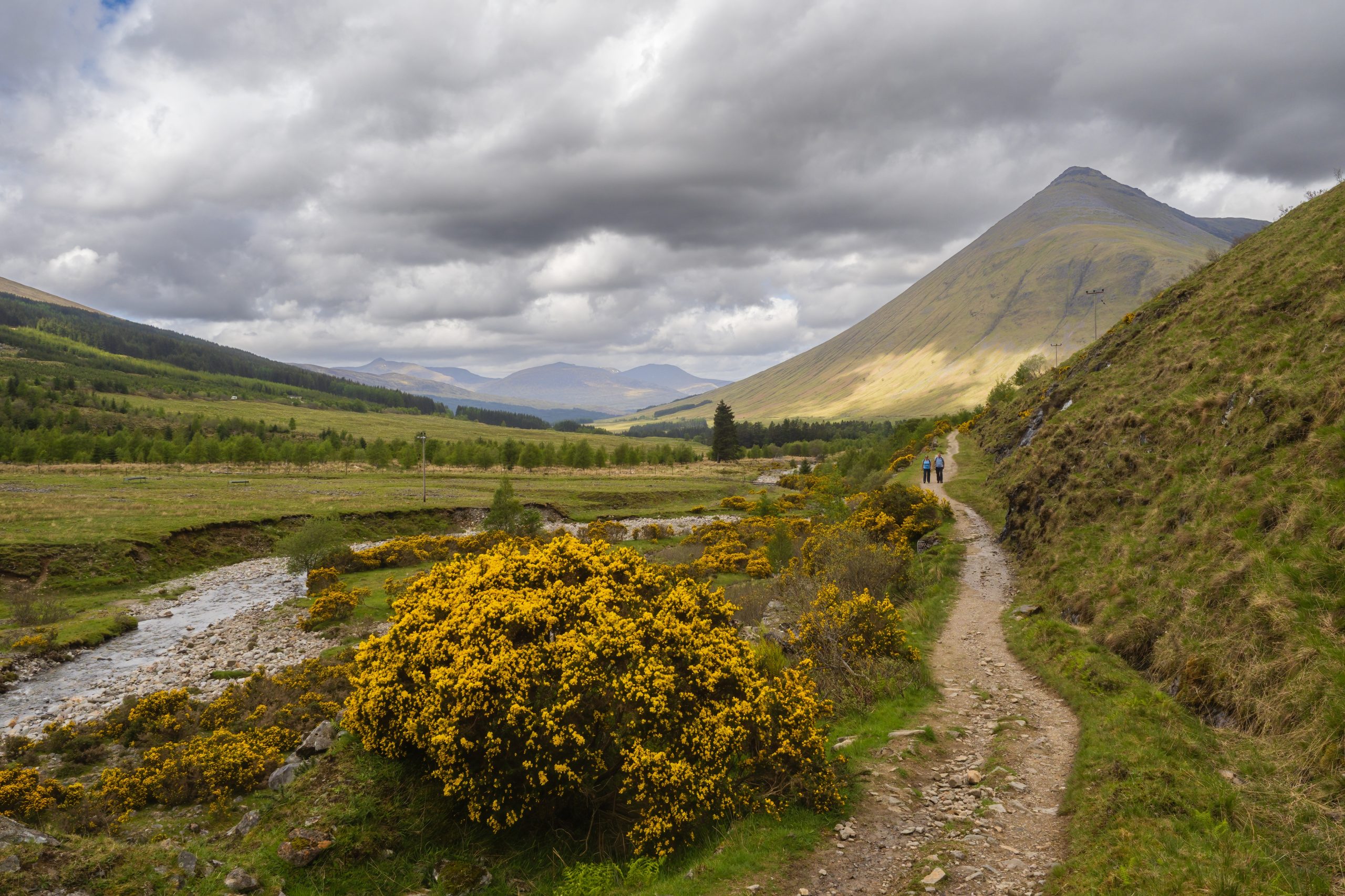 Esta es una etapa más corta y fácil; se mantiene en el fondo del valle tras la subida inicial desde Tyndrum, junto con la carretera y el ferrocarril, para llegar al Puente de Orchy, con magníficas vistas de las escarpadas montañas cubiertas de hierba a lo largo del camino. Desde allí, la ruta asciende por el bosque para cruzar una cresta baja antes de descender al solitario hotel de Inveroran.
